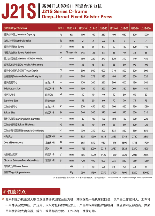 產(chǎn)品型號(hào):J21S 開式深喉口固定臺(tái)壓力機(jī) 產(chǎn)品類別:開式深喉口固定臺(tái)壓力機(jī)